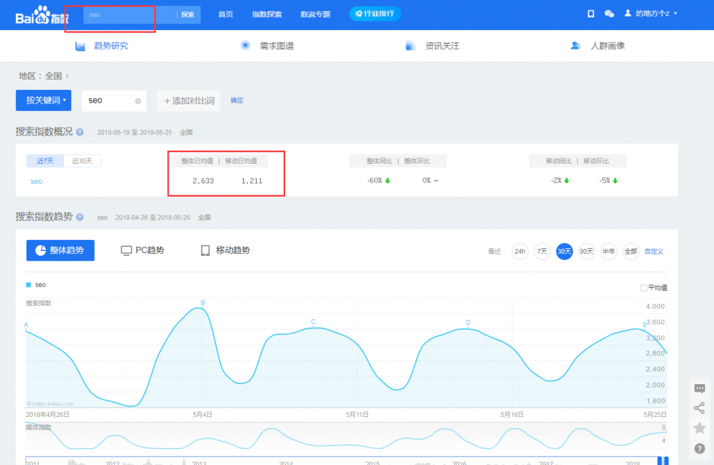 什么是百度指数?在搜索引擎中用户搜索某一个词,只要达到了一定的搜索量就会形成百度指数。可以说是要查询某个词是否有指数,我们就需要百度指数工具来看看这个词是否值得我们去研究与分析,当然也有其他的SEO推广软件工具一样能查看指数,这些指数都是漂浮不定。