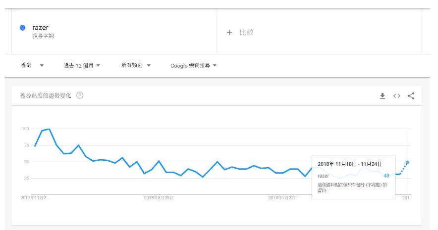 本地香港人搜索中文、英文以及两者的混合,所以知道哪种用法最流行是非常重要的。继续以“razer”为例,我们可以看到11月的搜索越来越受欢迎。与此同时,使用拉泽的中文术语,我们看到受欢迎程度稳步下降。