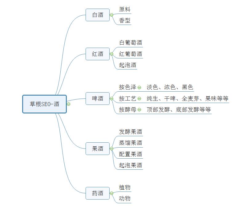 如上图所示,白酒是一种蒸馏酒,其他类型包括伏特加、白兰地、威士忌、朗姆酒、杜松子酒等。上面的分类只是一个简单的分类,它允许我们清晰直观地找到后面列出的关键词。当然,如果你想要更详细的分类,你可以自己理解相关的类型,这里没有太详细的分类。
